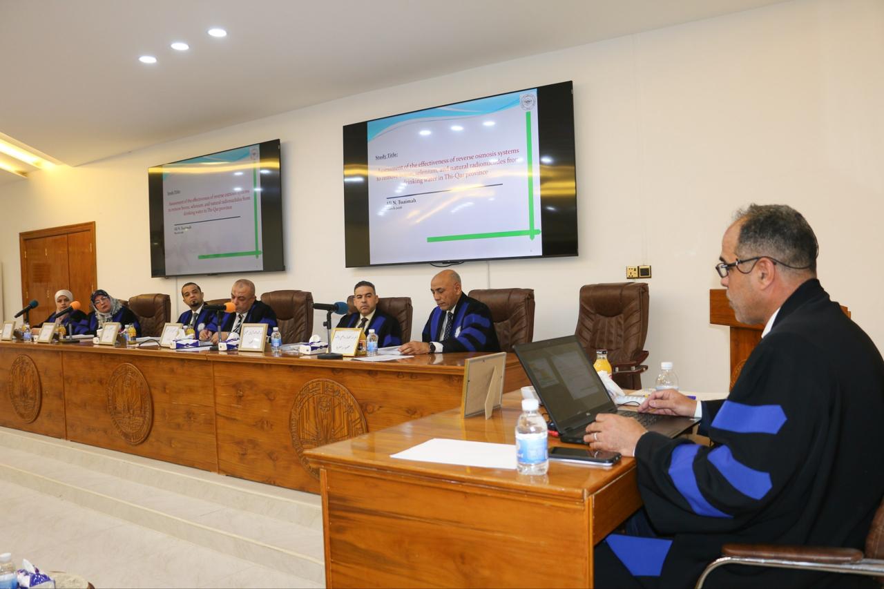 رئيس جامعة ذي قار يحضر مناقشة علمية في كلية العلوم ويؤكد أهمية توظيف البحث العلمي في تحسين جودة مياه الشرب