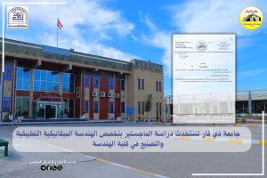 أعلنت جامعة ذي قار عن استحداث دراسة الماجستير بتخصص ميكانيك / هندسة ميكانيك تطبيقي وتصنيع في قسم الهندسة الميكانيكية، وذلك بعد استحصال الموافقة الرسمية من وزارة التعليم العالي والبحث العلمي، في خطوة تهدف إلى دعم برامج الدراسات العليا ومواكبة متطلبات التطور العلمي والتقني.